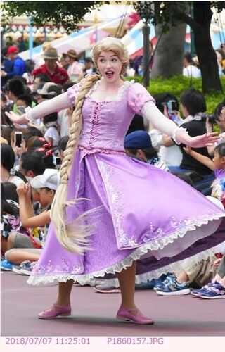 ラプンツェル 〈七夕グリーティング〉 七夕のコスチュームの彦星(ミッキーマウス)と織姫(ミニーマウス)が人力車に乗って、ディズニーの仲間たちと「笹の葉さーらさら〜♪」の曲とともにごあいさつするパレードです。 このパレードの最後に塔の上のラプン…
