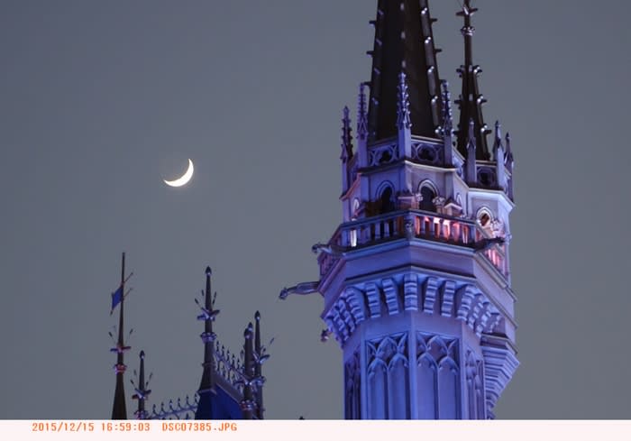2015-12-17 三日月 TDLシンデレラ城の向こうに 東京ディズニーランド 三日月 シンデレラ城 (東京ディズニーランド) 【三日月とシンデレラ城の写真】 平成27年12月15日撮影 マークトウェイン号の船乗り場の風見鳥 三日月だけを撮影